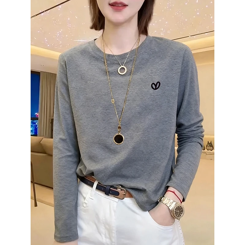 春秋冬季新款纯棉高级灰圆领正肩长袖T恤女内搭打底衫修身上衣潮